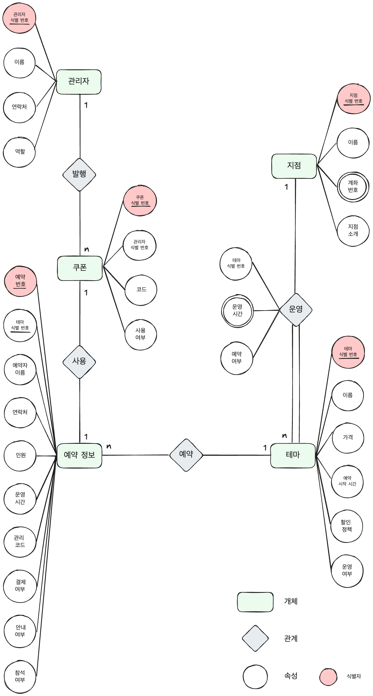테마는 지점에서 관리되기 때문에 '지점이 테마를 관리한다'라는 관계에 '운영 시간(입장 시간)'과 '예약 여부' 속성을 포함시키게 되었습니다.