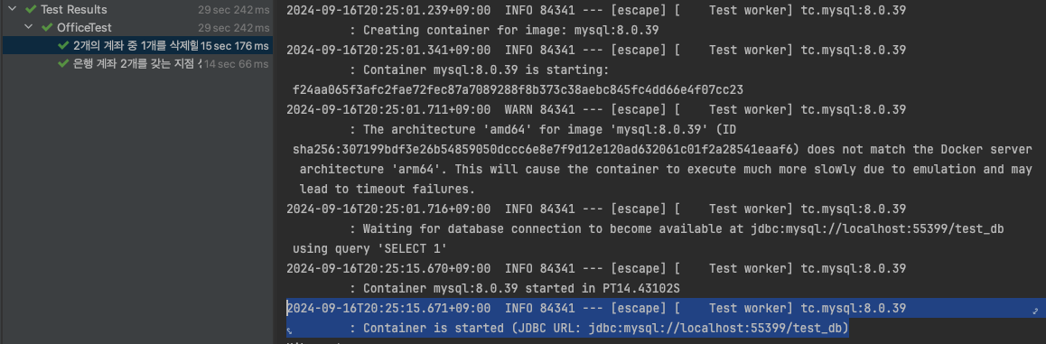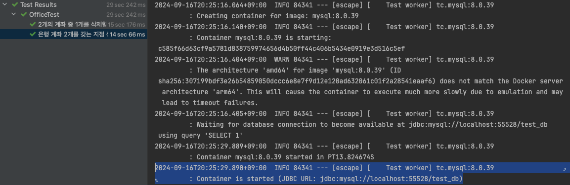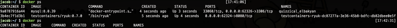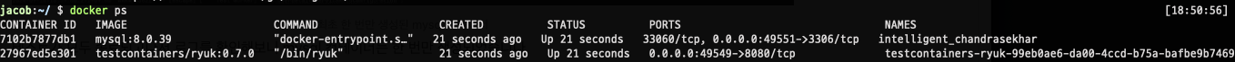 도커 컨테이너 목록도 두 개의 테스트가 진행되는 동안 mysql 컨테이너는 한 개만 띄워졌습니다.