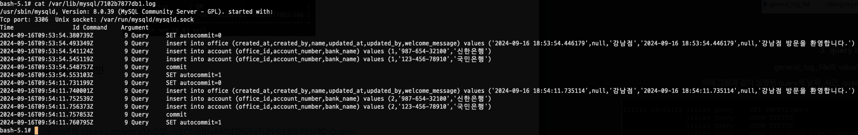 - 테스트 후 쿼리 실행 로그와 테이블을 조회한다.