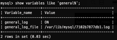 - general_log 값과 로그 파일이 저장되는 위치 확인