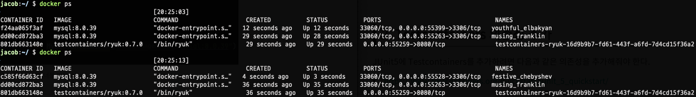 이 방법을 이용하면 매번 테스트마다 새로운 컨테이너가 생기는 것을 확인할 수 있습니다.