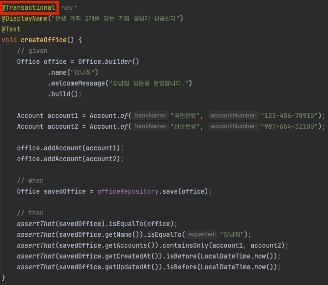 assertThat(savedOffice.getName()).isEqualTo("강남점");
