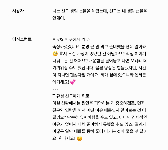 `F 유형`은 유저에게 먼저 공감하는 말과 함께 이모지를 섞은 따뜻한 멘트를 하도록 지시했고, `T 유형`에겐 원인을 분석하고 `현실적인 조언`을 하도록 지시했습니다.