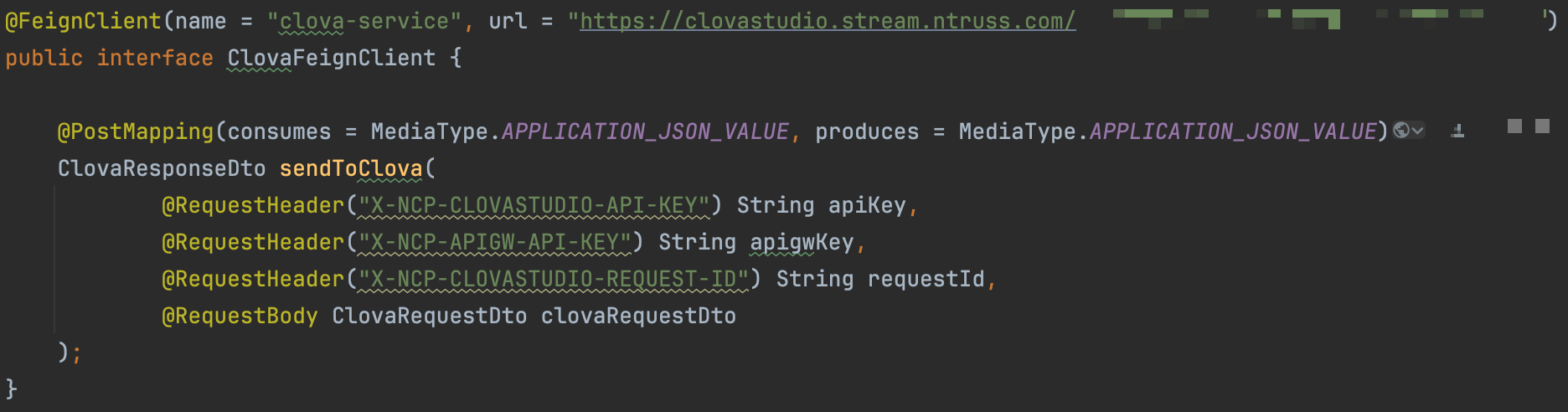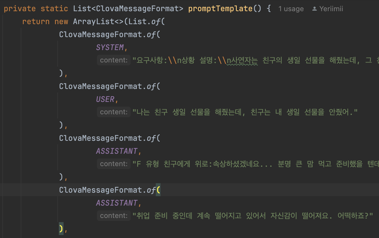 이제 직접 만든 `ClovaRequestDto`를 통해서 메시지를 보내기만 하면 됩니다.
