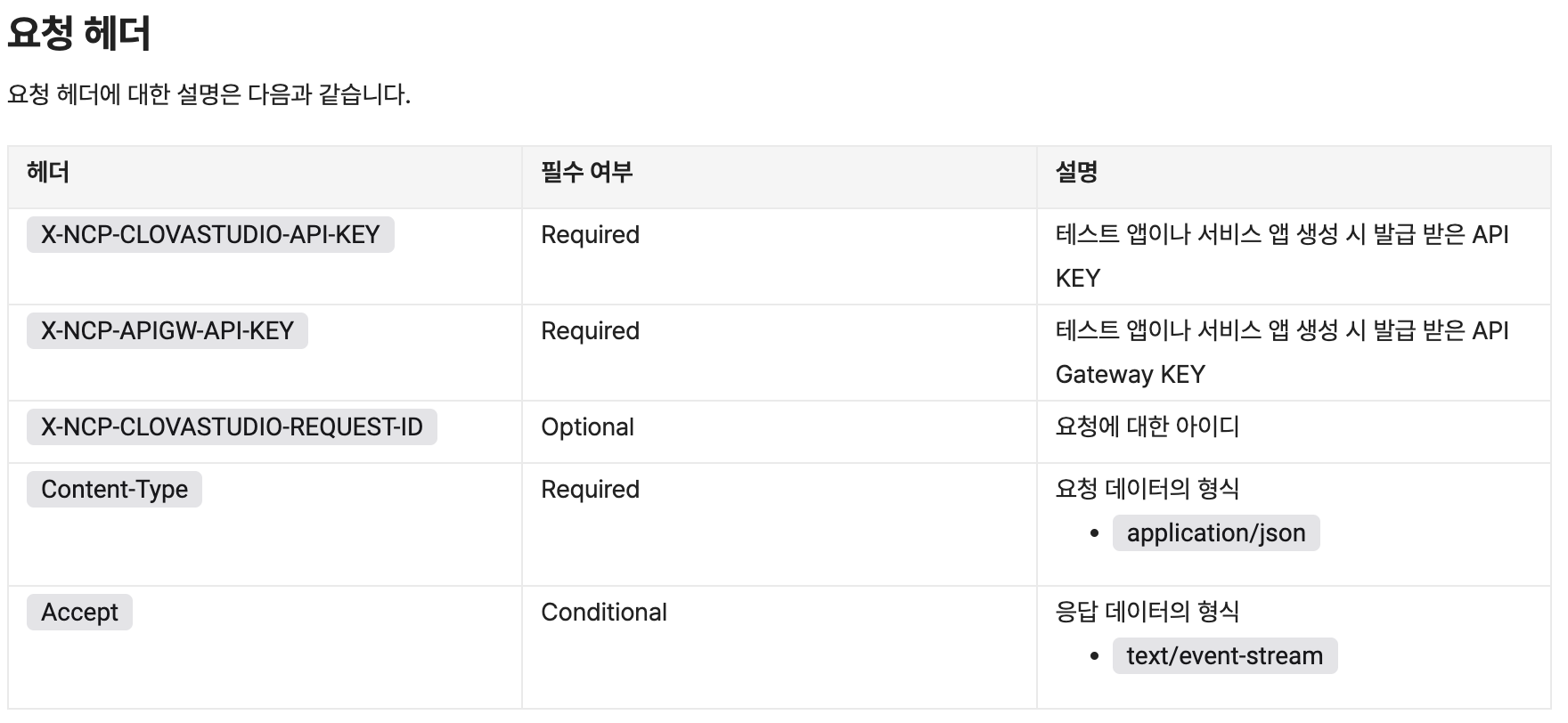 Clova X 에게 메시지를 전송하려면 필요한 요청 헤더(Request Header) 들이 있는데요, 아래 Naver Cloud Platform API 가이드에 따르면 3개의 헤더가 필수로 필요할 것을 알 수 있습니다.