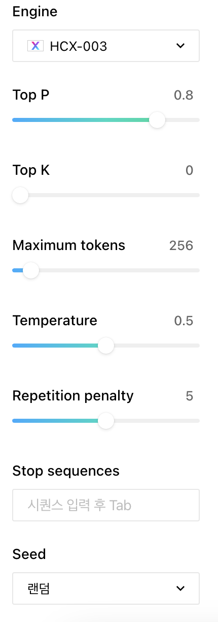 그리고, 요청 메시지를 보낼 때 `생성할 토큰의 다양성`, `최대 토큰 개수`, `결괏값의 일관성` 등을 설정하는 부분을 함께 보내면 되는데요,