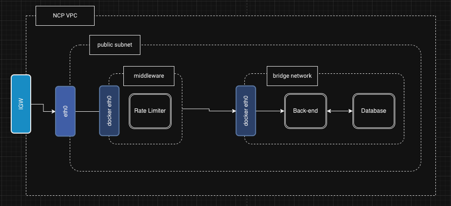 처리율 제한 장치는 미들웨어로 두는 방법과 기존 네트워크에 놓는 방법이 있는데요, 아래 미들웨어에 둘 때와 같은 도커 네트워크(브릿지)에 둘 때 구성도를 보겠습니다.