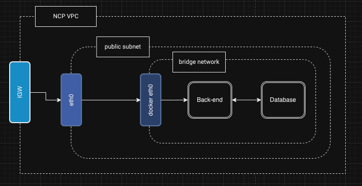 하나의 브릿지 네트워크 안에 `Back-end` 컨테이너와 `Database` 컨테이너가 있습니다.