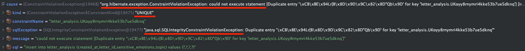 - 이후, 감정 분석 테이블에 저장 시 유니크 키 제약조건에 의해 `DataIntegrityViolationException` 예외가 발생합니다.