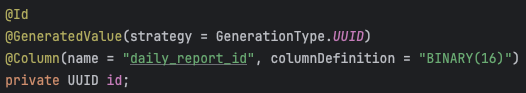 - id 생성 전략이 `GenerationType.UUID`로 설정되어 있습니다.