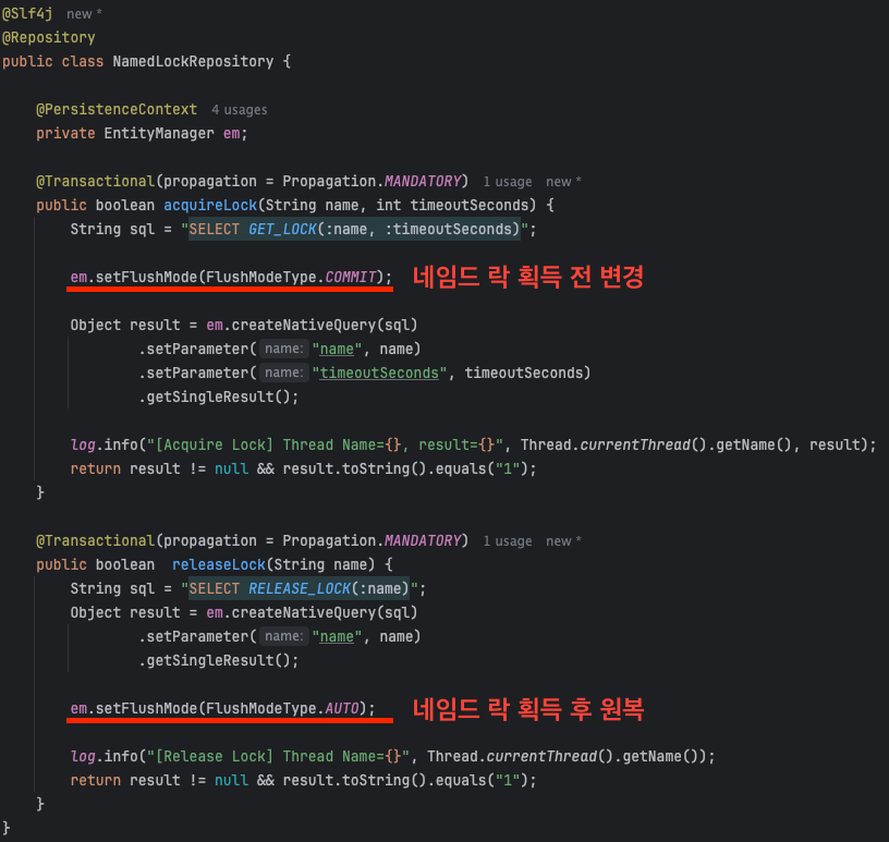 - 네임드 락 획득: 잠금을 획득하기 전에 플러시 모드를 `COMMIT`으로 변경합니다.