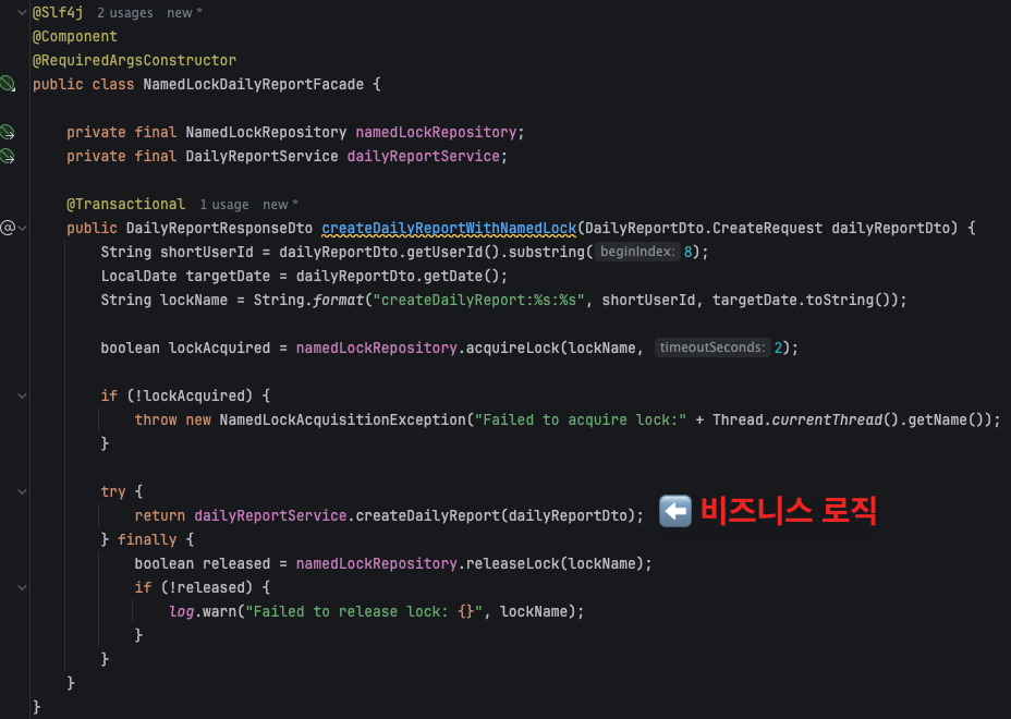 - 퍼사드 클래스에서 기존 서비스와 네임드 락 서비스를 주입받습니다.