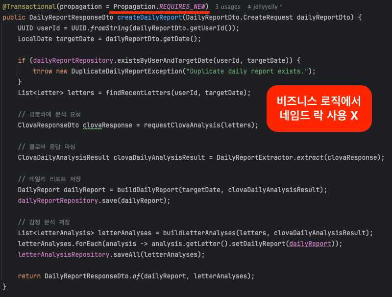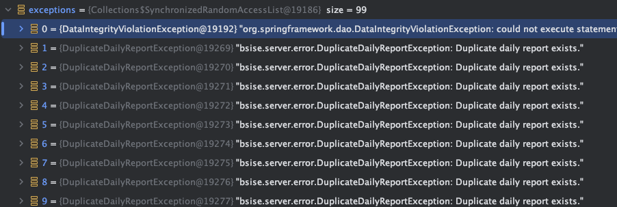의도치 않은 예외들이지만 다행히도 `데일리 리포트 중복 생성 확인` 부분에서 중복 생성을 검증해서 외부 API가 여러 번 호출되는 것은 막았습니다.