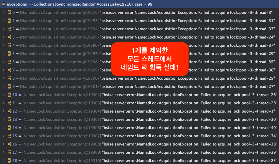 예상대로라면 네임드 락 실패 예외인 `NamedLockAcquisitionException`가 99개 있어야 합니다.