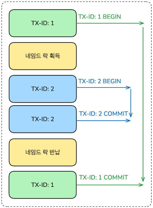 만약 롤백이 발생하면 `TX-ID: 2` 트랜잭션에만 영향이 미칩니다. - 이후 네임드 락을 반납하고 `TX-ID: 1` 트랜잭션에서 커밋을 통해 트랜잭션을 종료합니다.
