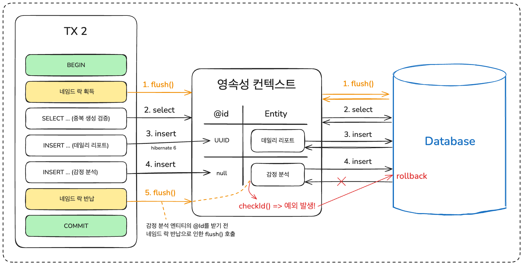 플러시가 발생하면서 `checkId()`로 엔티티들의 id가 유효한지 확인하지만 아직 데이터베이스로부터 auto_increment 된 아이디를 받지 못해 엔티티의 id는 `null`입니다. - 위와 같은 이유로 `AssertionFailure` 예외가 발생했고, 이는 런타임 예외이기 때문에 롤백이 수행됩니다.