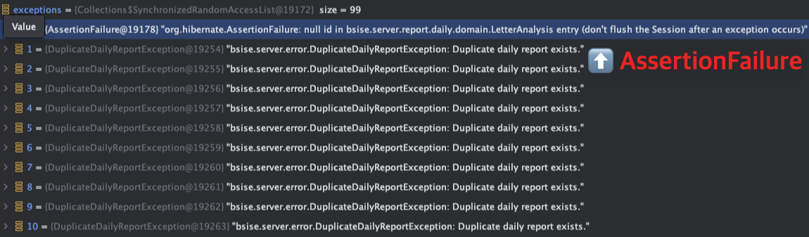 몇 번 테스트를 수행한 결과를 보면 `AssertionFailure` 예외에서 `DataIntegrityViolationException` 예외로 변한 것을 볼 수 있습니다!