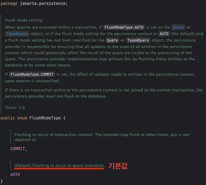 플러시 모드는 `jakarta.persistence` 패키지에 `enum` 타입으로 추상화가 되어있는데요, 2가지 타입으로 되어있습니다.