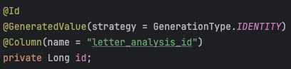 - id 생성 전략이 `GenerationType.IDENTITY`로 설정되어 있습니다. (기본 키 생성을 데이터베이스에게 위임)