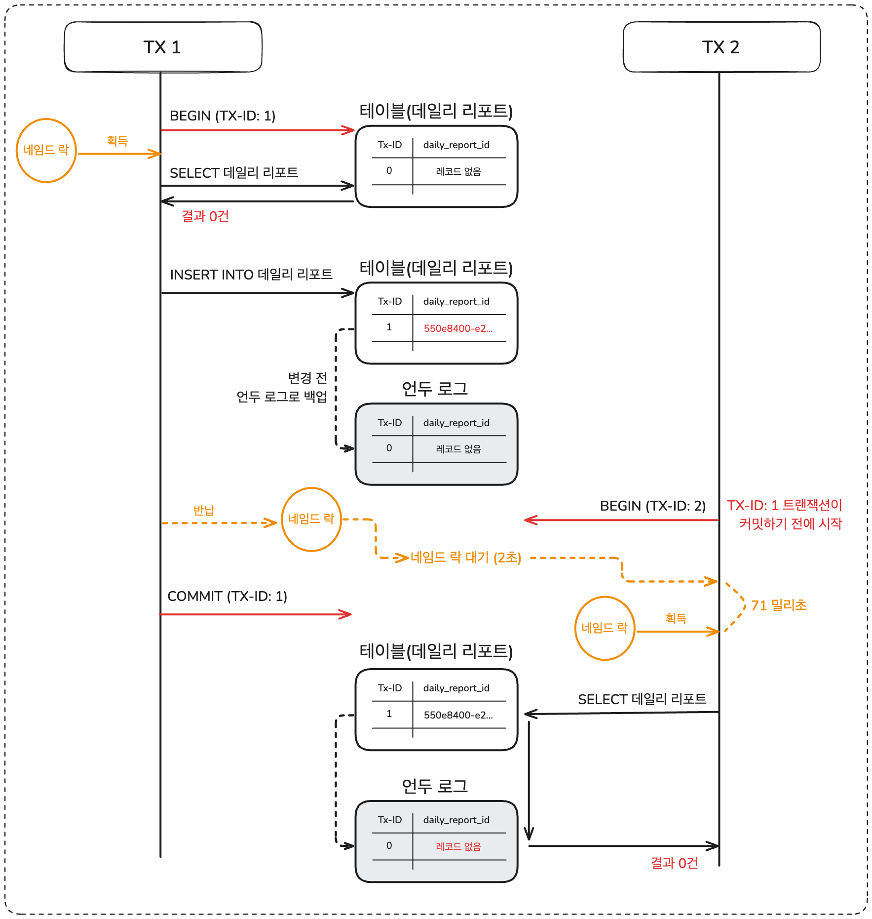 - `TX-ID: 2`: 데일리 리포트 중복이 있는지 조회합니다. `TX-ID: 1`이 `COMMIT`을 하기 전에 트랜잭션을 시작했으므로 언두 영역을 읽습니다. 레코드가 존재하지 않아 0건을 가져옵니다.