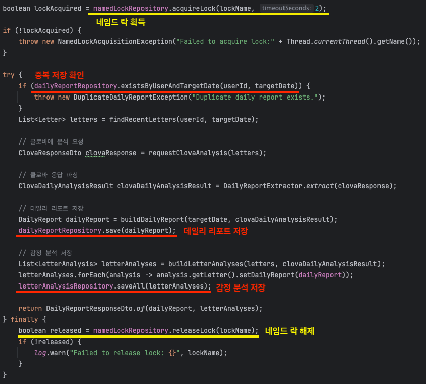 이유는 첫 번째 문제의 원인과 동일하게 `4. 감정 분석 저장`과 `5. 네임드 락 반납` 부분에서 동기화가 되지 않았기 때문입니다.