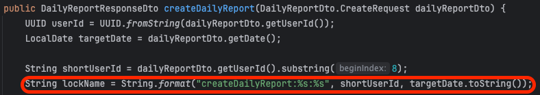 기존 서비스 코드에서는 네임드 락의 고유성을 보장하기 위해 사용자의 아이디와 요청일을 네임드 락 이름의 일부로 사용했었습니다.