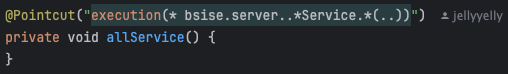 AspectJ 표현식으로 루트 패키지부터 하위 패키지까지 `*Service`로 끝나는 클래스(또는 인터페이스)에 적용을 합니다.