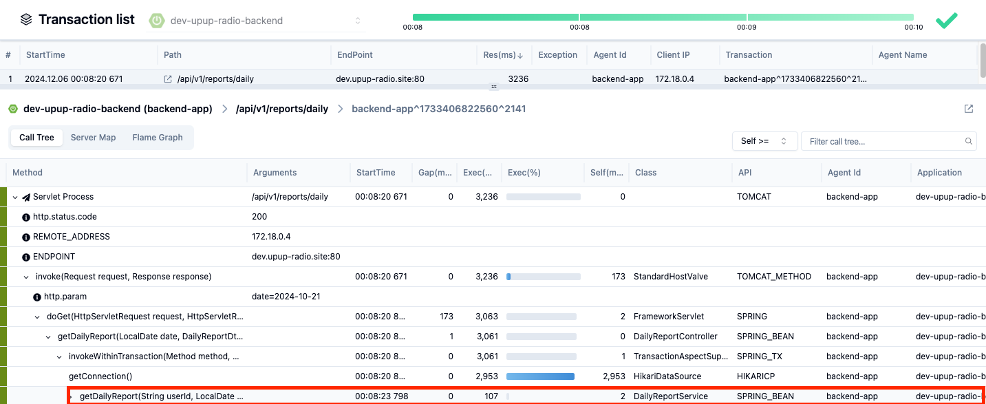 핀포인트로 확인한 가장 느린 트랜잭션에서는 `107ms` 였습니다.