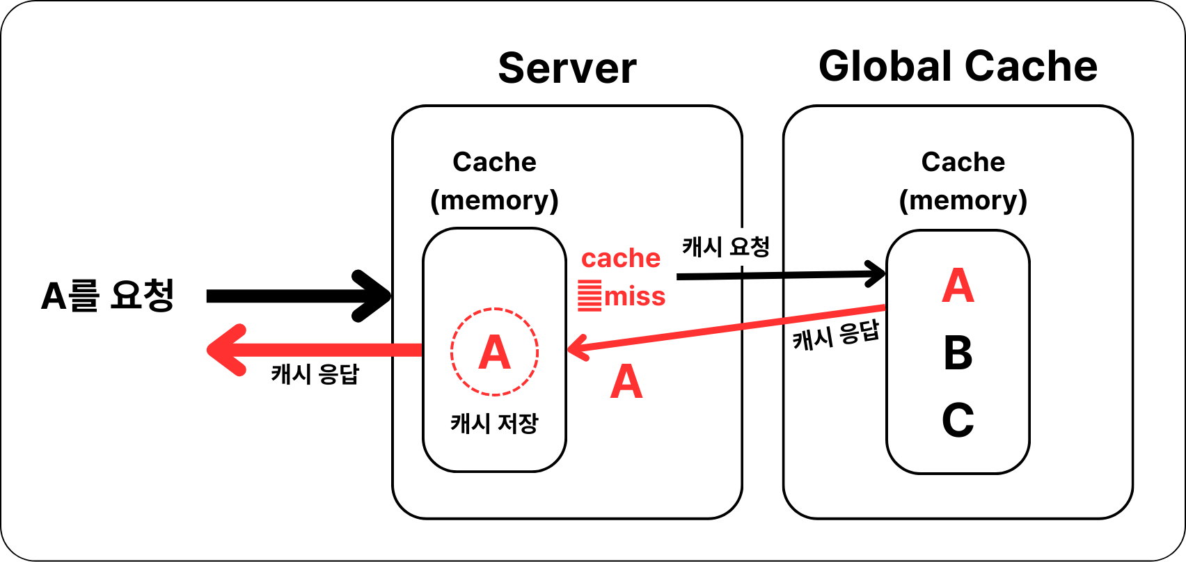 정합성이 필요한 캐시 데이터를 글로벌 캐시에 저장하고, 이렇게 저장된 캐시 데이터를 다시 로컬 캐시에 저장하는 방식입니다.