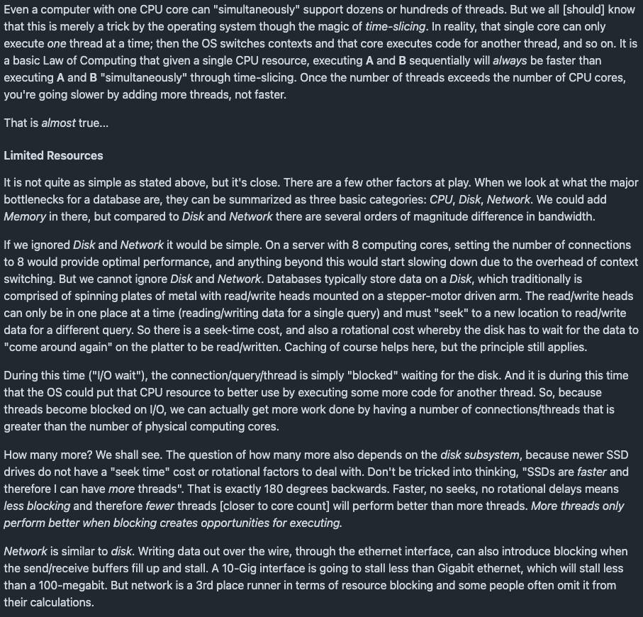 그리고 SSD는 더 빠르고, 플래터 탐색이나 회전이 없다고 해서 더 많은 스레드를 사용할 수 있는 것은 아닙니다. 오히려 정반대로 `"blocking"`이 적기 때문에 CPU 코어 개수에 근접한 더 적은 스레드를 사용하는 것이 더 많은 스레드를 사용하는 것보다 성능이 더 좋습니다. - 네트워크 문제도 있습니다. 전송할 데이터가 많으면 송신/수신 버퍼가 가득 차 네트워크 지연이 발생할 수 있습니다.