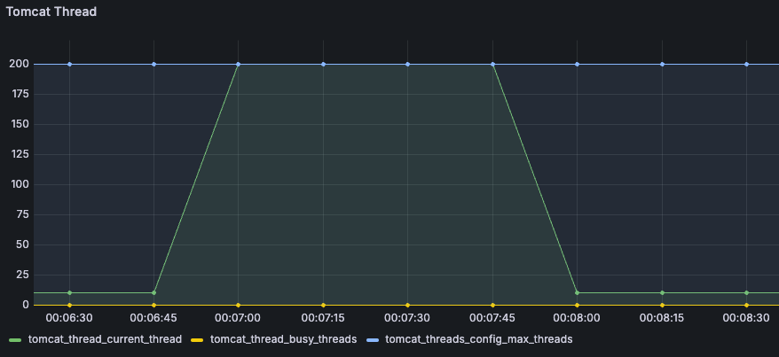 0시 6분 45초부터로 급격히 활성화된 스레드 수가 증가하다 0시 7분쯤부터 최대 개수인 200개에 도달한 모습입니다.