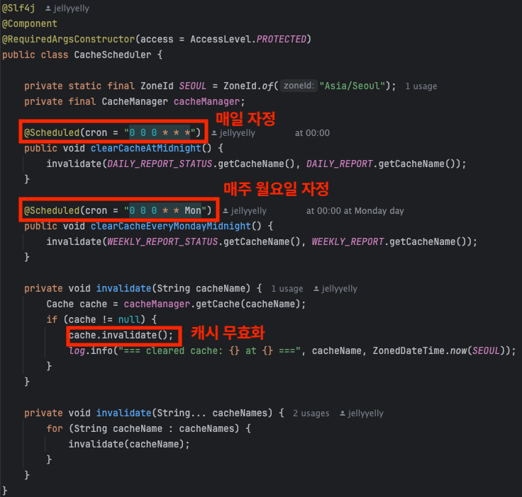 - `매일 월요일 자정`에는 `위클리 리포트 관련 API` 관련 캐시를 모두 무효화합니다.