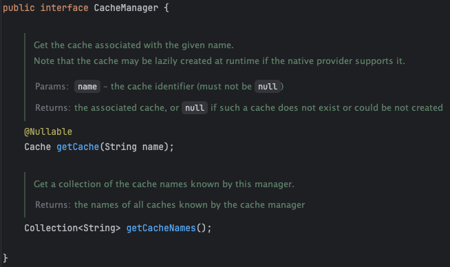`CacheManager` 인터페이스는 간단하게 `getCache()`, `getCacheNames()`로 되어있습니다.