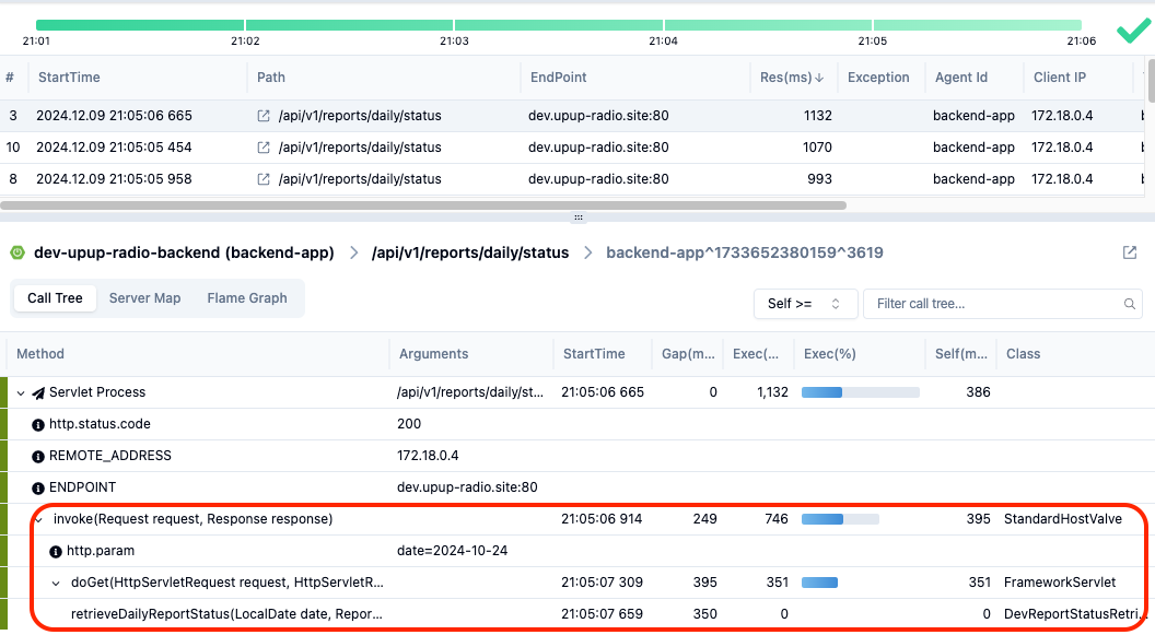 핀포인트를 통해 확인한 가장 느린 응답 속도로 집계된 트랜잭션의 세부 내역을 보면, 데이터베이스에 더 이상 접근하지 않기 때문에 커넥션 대기 시간이 사라졌지만 HTTP 요청 자체를 처리하는데 시간이 오래 걸린 것을 보아 톰캣 스레드 풀의 문제로 보입니다.
