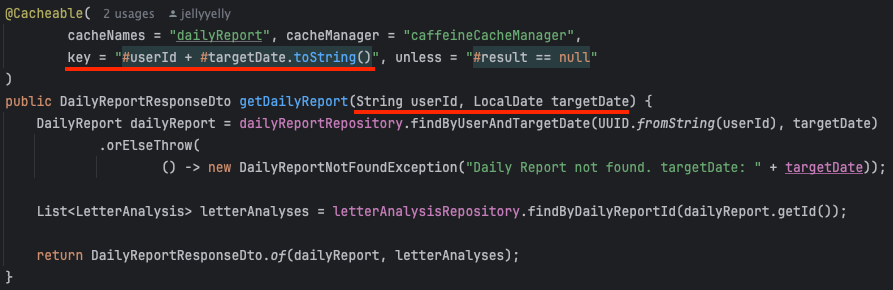 - 아무것도 지정하지 않으면 메서드의 모든 매개변수를 조합해서 `SimpleKey` 객체로 키를 생성합니다. 매개변수가 없으면 `SimpleKey.EMPTY`가 키로 사용됩니다.