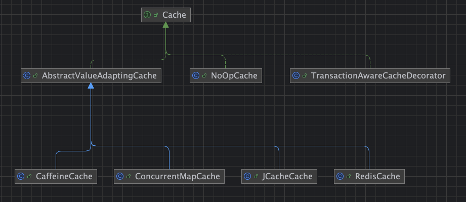 스프링에서 기본으로 지원하는 여러 종류의 캐시들은 `Cache` 인터페이스의 구현체들인데요,