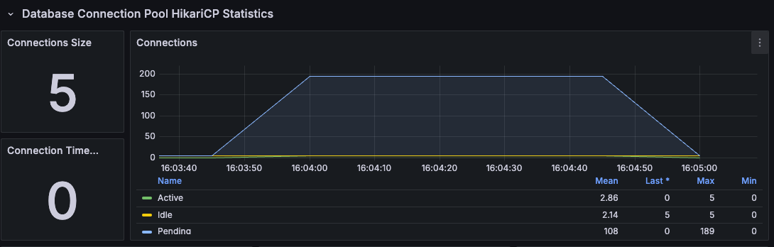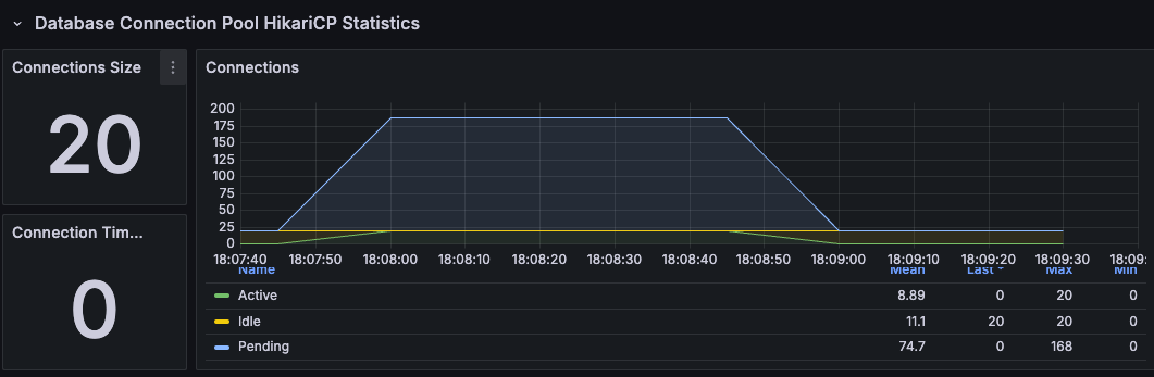 참고로 이전 포스팅에서 설명했듯이 HikariCP 설정을 통해 최대 사이즈를 늘려도 그 개수만큼 즉시 증가시키지 않습니다. 커넥션을 열고 닫을 때 컴퓨팅 자원이 사용되기 때문에 HikariCP가 실제 사용량에 맞춰서 점진적으로 늘립니다.