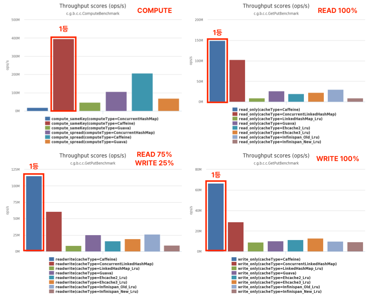 - Google에서 제공하는 오픈 소스 라이브러리인 Guava Cache와 ConcurrentHashMap을 개선한 ConcurrentLinkedHashMap을 바탕으로 개선된 `In-Memory` 캐시 구현체입니다.