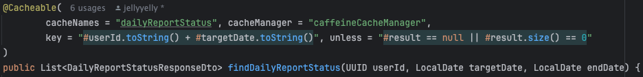 - `#result`는 메서드가 반환하는 값이며, 예시에선 해당 값이 `null`이면 캐싱을 하지 않는다는 조건입니다.