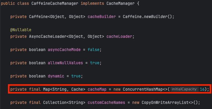 기본적으로 캐시를 저장하는 `ConcurrentHashMap`에는 최대 16개의 `Cache` 객체만 저장할 수 있으며 캐시를 찾을 때는 문자열로 된 캐시 이름으로 찾을 수 있습니다.