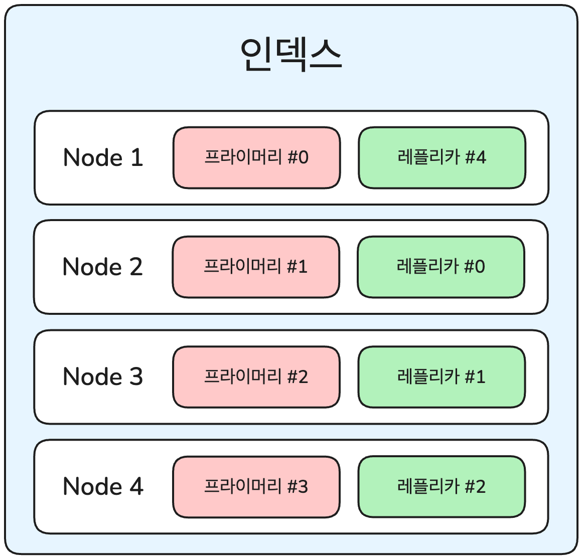 - 노드 별로 원본(프라이머리) 샤드의 번호와 복제본(레플리카) 샤드의 번호가 겹치지 않게 할당됩니다.