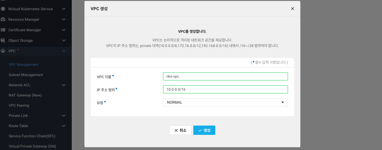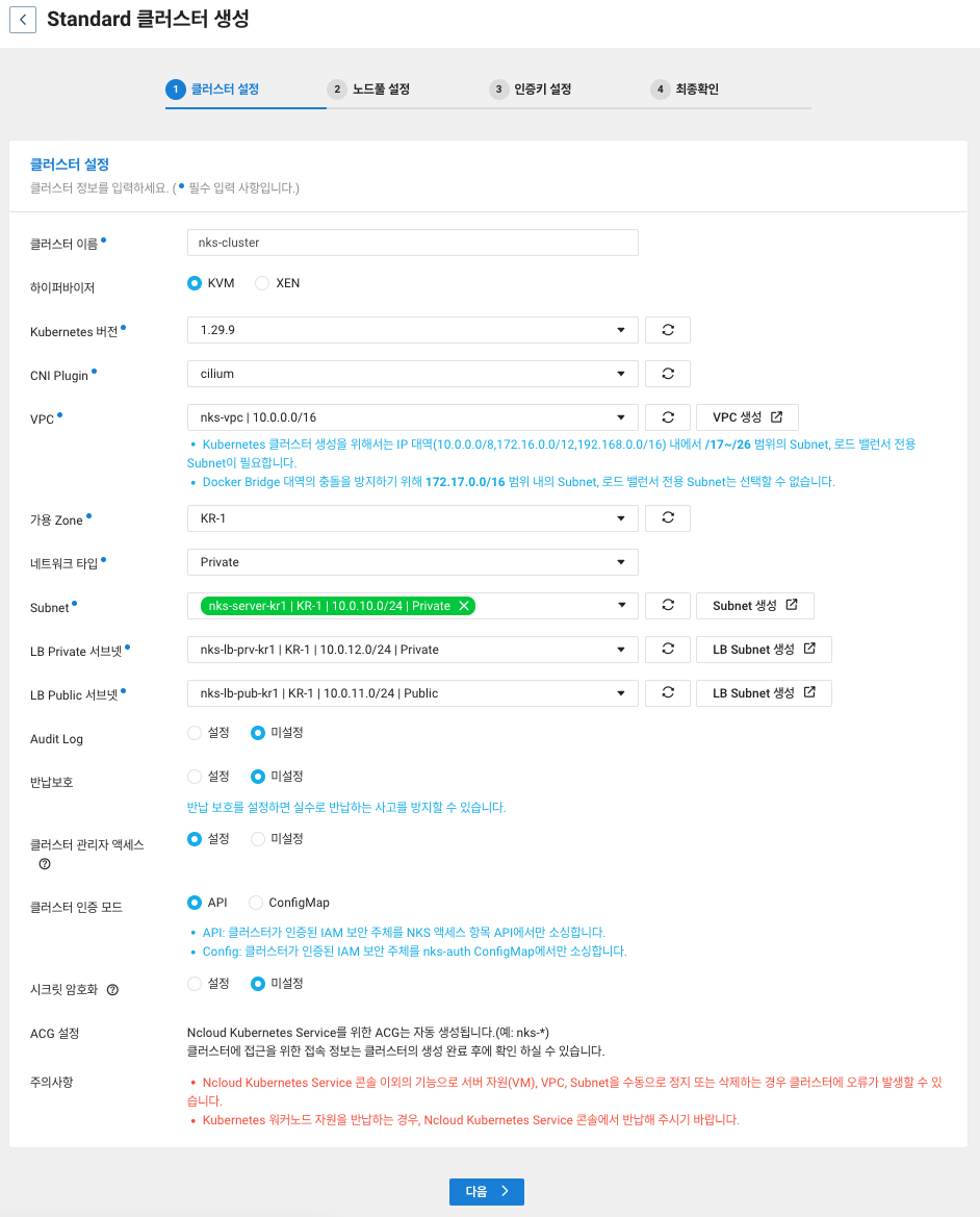 VPC는 위에서 생성한 NKS 전용 VPC를 선택하고, 가용 Zone은 `KR-1`만 사용했습니다.