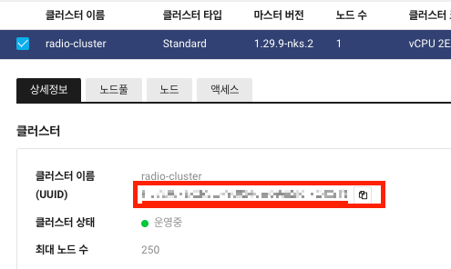 region code는 `KR`을, cluster-uuid는 NKS 콘솔 화면에서 클러스터의 UUID를 찾아 입력합니다.