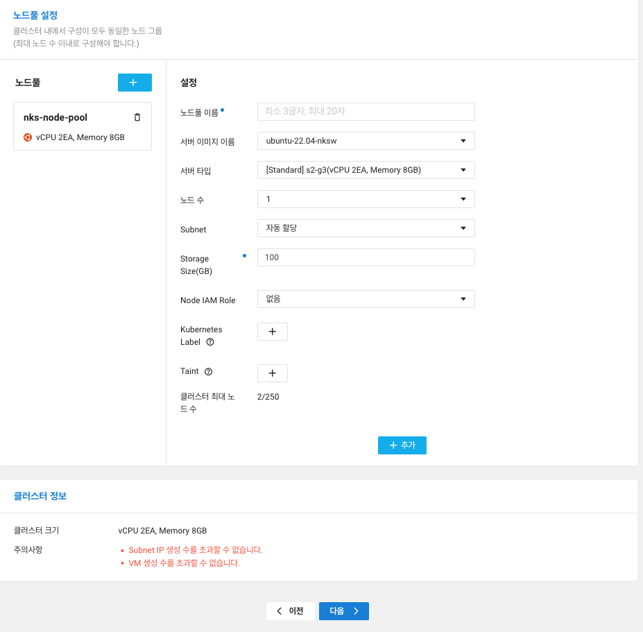 노드풀 설정 화면에서는 노드들이 생성되는 노드풀에 대한 설정을 할 수 있습니다.