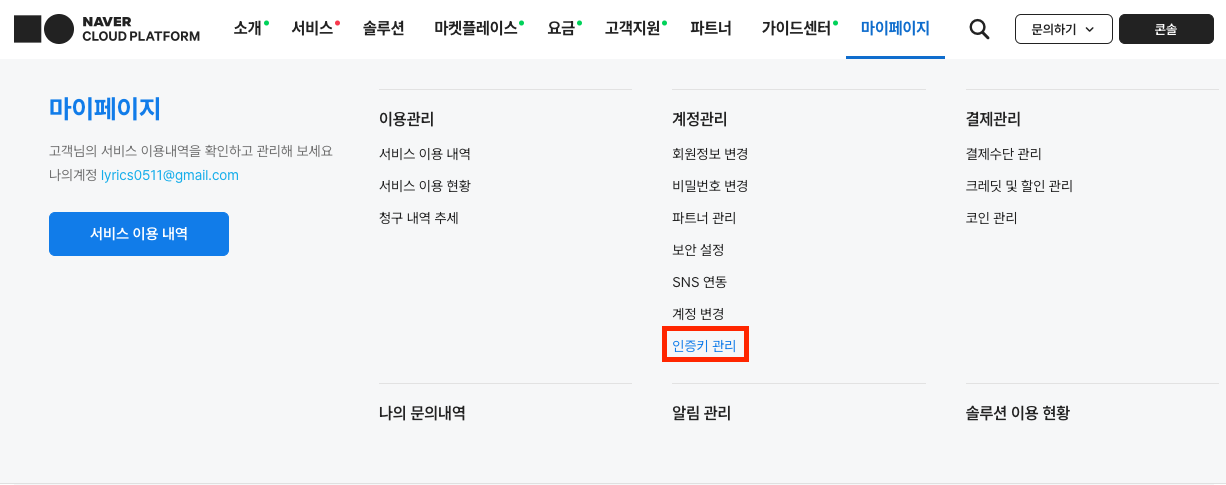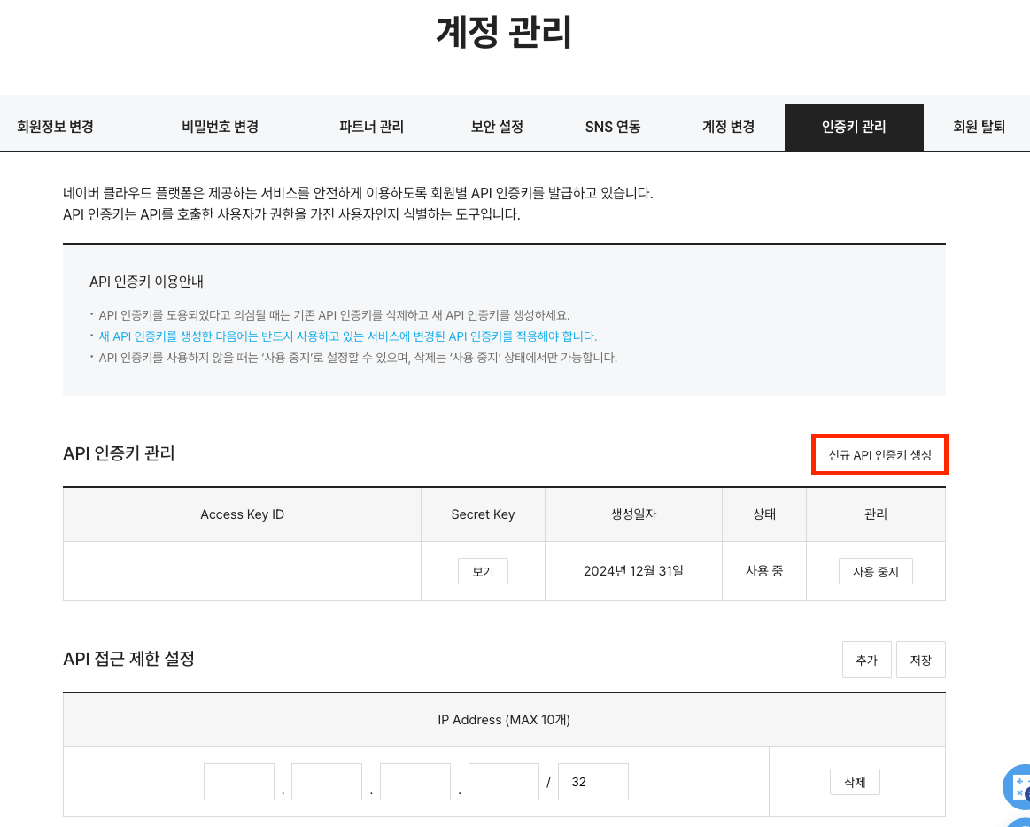 ncp-iam-authenticator를 사용하려면 API 인증키가 필요한데요, 네이버 클라우드 플랫폼 홈페이지에서 "마이 페이지>계정 관리>인증키 관리" 메뉴에서 찾을 수 있습니다. (ncloud 공식 문서)