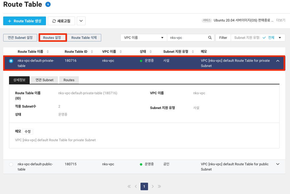이곳에서 private-table을 찾아 `Route 설정` 버튼을 눌러 NAT Gateway를 추가합니다.