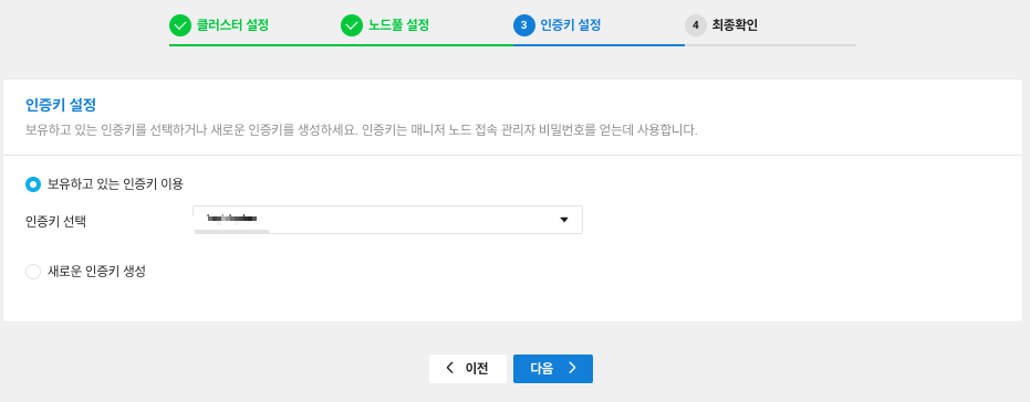 인증키 설정 화면에서는 인증키 설정을 통해 노드 접속을 위한 관리자 비밀번호를 얻는데 사용할 수 있습니다.