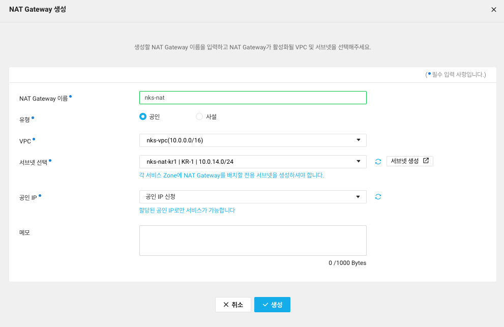 VPC는 위에서 생성한 NKS 전용 VPC를 지정하고, 서브넷은 NAT Gateway 용도로 생성했던 서브넷을 선택합니다.