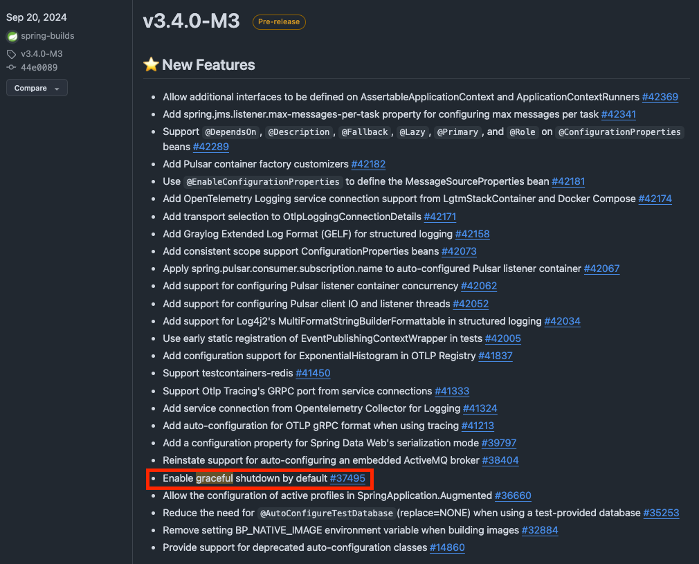 하지만 graceful shutdown은 3.4.0-M3 버전부터 기본값으로 제공하며, 이전 버전을 사용한다면 `application.yaml`에서 별도의 설정이 필요합니다.