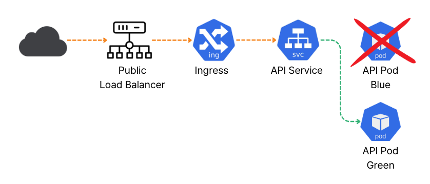 `Green` 버전 파드가 트래픽을 정상적으로 처리할 수 있는 상태가 되면 서비스가 `Green` 버전 파드를 바라보도록 수정합니다.